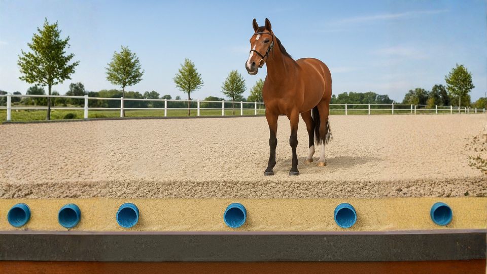 Ein Ebbe-Flut-Reitplatz sorgt für konstant optimale Reitbedingungen egal ob bei Trockenheit oder Starkregen. Durch ein integriertes Wassermanagement wird der Reitboden gleichmäßig von unten befeuchtet. Das Ergebnis: weniger Staub, mehr Trittsicherheit und deutlich geringerer Pflegeaufwand.